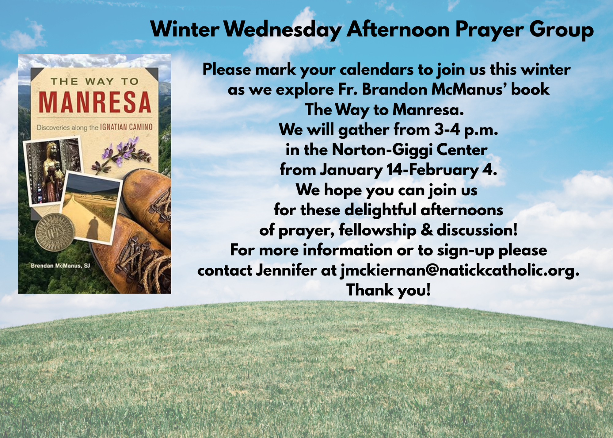 Please join us for afternoons of prayer, reflection and discussion on Wednesdays from 3:00-4:00 p.m. in the Norton-Giggi Center at St. Linus. These prayer programs will be offered several times during the year through a variety of different series and book discussions.